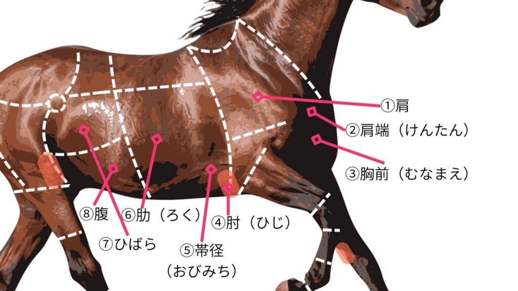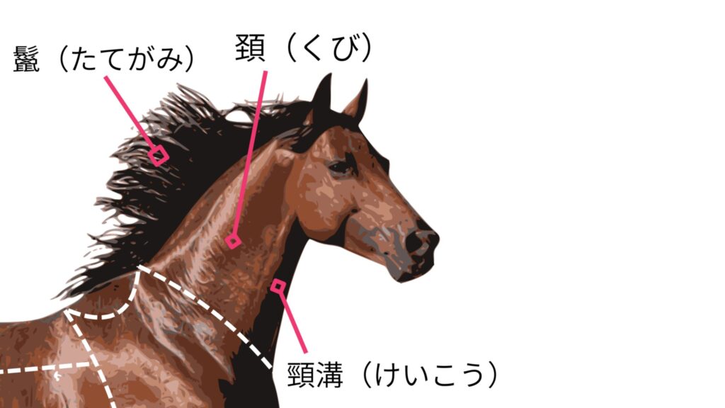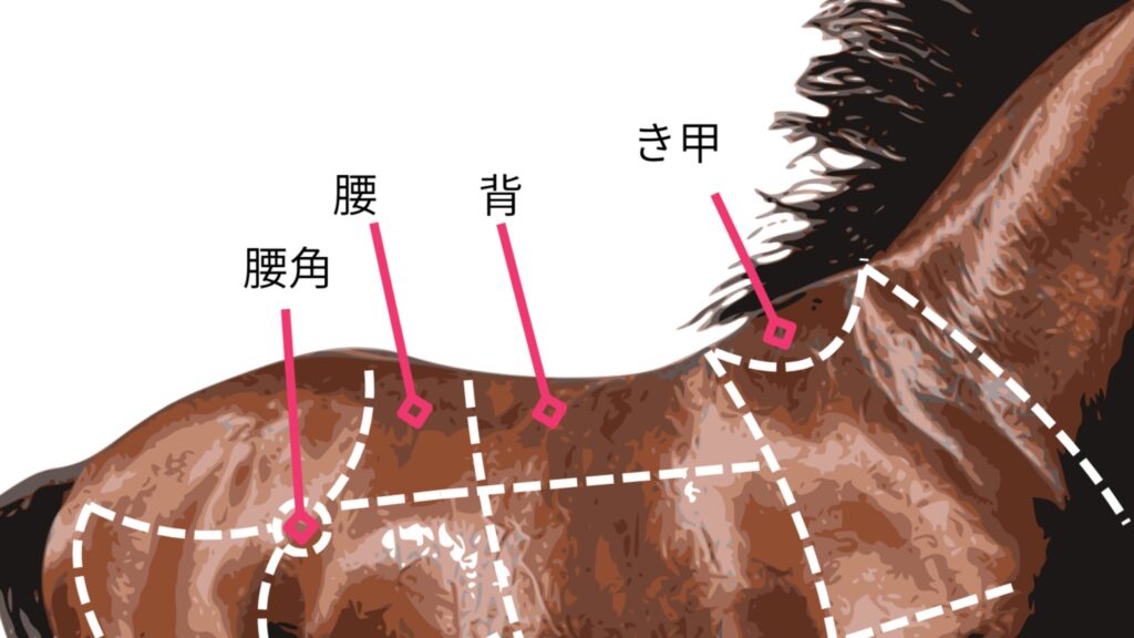 き甲(きこう):首と背中の間で、肩の一番高い部分。鞍を置く位置の目安にもなります。