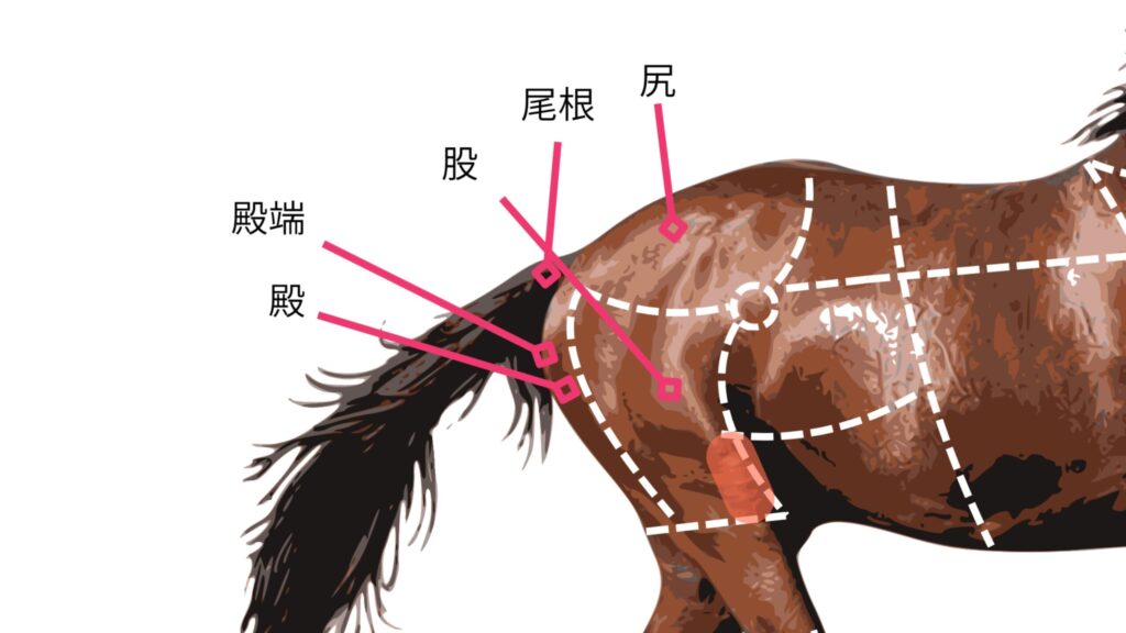 殿端(でんたん):尻の後ろ端、尾のすぐ下あたり。