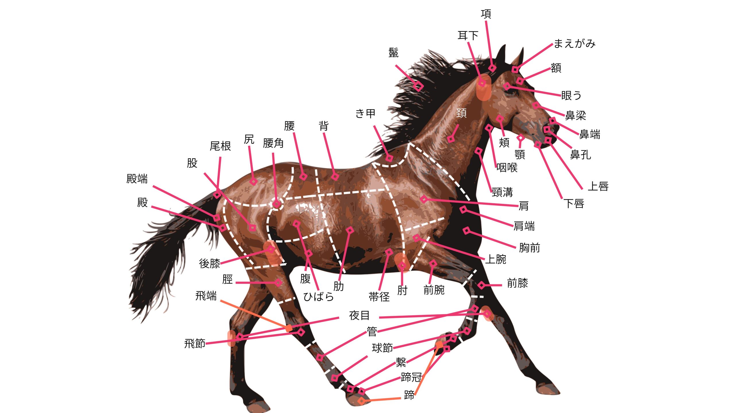 今回は、馬の体の名称を図解で順番に紹介しました。頭、頚、胴、肢と大きく分けることで、初心者でも覚えやすくなっています。