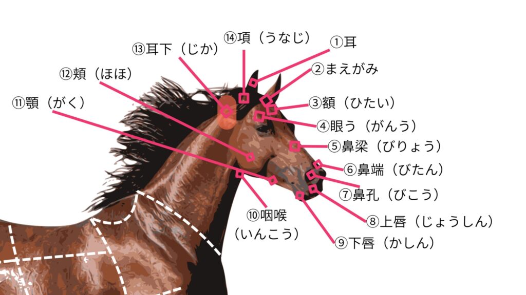 馬の体を正しく理解することは、安全に接することや馬との信頼関係を築く第一歩になります。まずは図を見ながら少しずつ触れて覚えていきましょう。特に敏感な部位に触れるときは、馬の様子をよく観察しながら行うことが大切です。